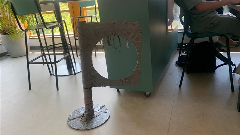 Als eerst hebben we een piepschuim blok uitgesneden en vastgemaakt aan de kartonnen buis. Vervolgens hebben we het stuk hout uitgesneden met de lasercutter. De cirkel hebben we als basis gebruikt en het uitgesneden platvorm hebben aan de bovenkant vastgemaakt. Als laatst hebben we alles 'verpakt' in duct tape en sliertjes duct tapes eraan geplakt. We hebben ook logo's op het obstakel geplakt, maar deze heeft iemand eraf gehaald.